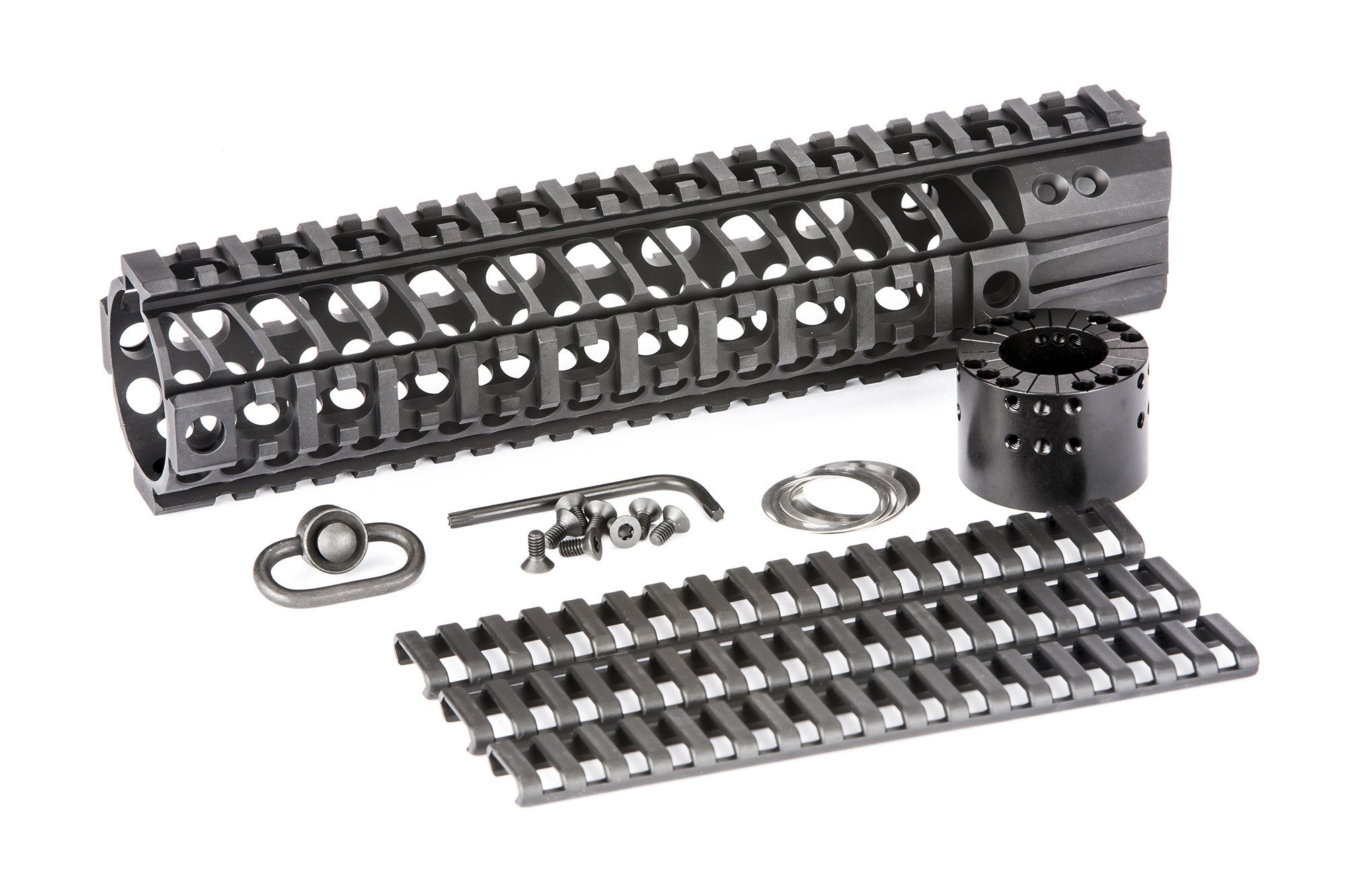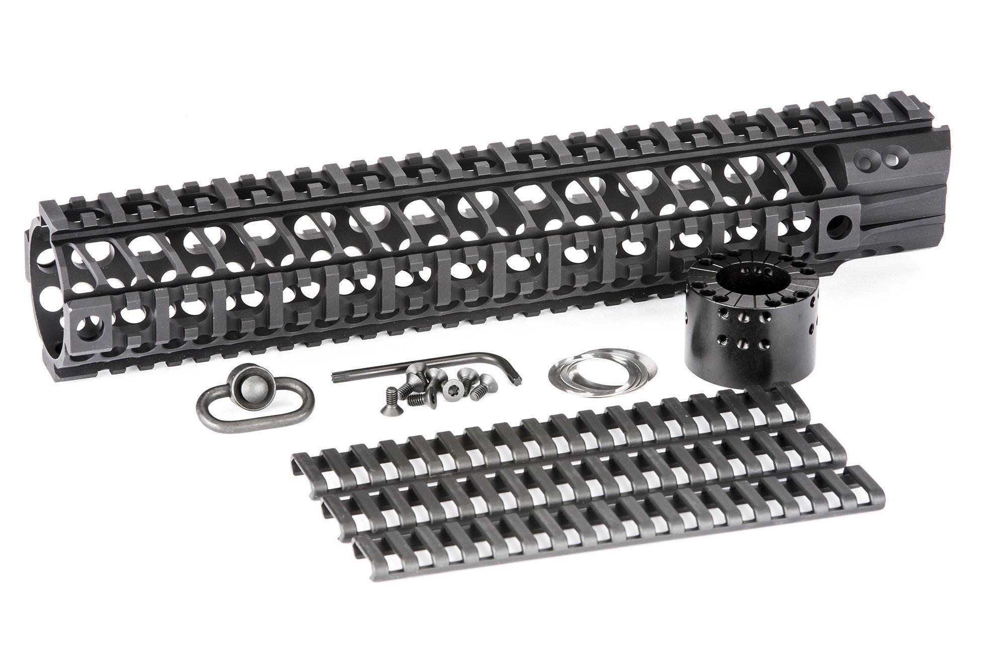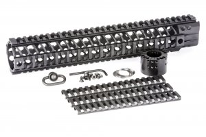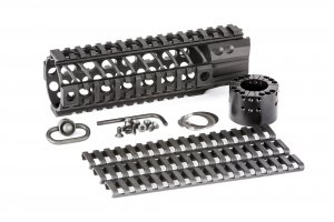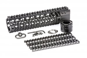 The Spike’s Tactical LW BAR2 (Big Ass Rail) is a 1pc free floating quad-rail that is machined from 6061-T6 aluminum with a barrel nut machined from 7075-T6 aluminum and finished in type III hardcoat anodizing on the rail and barrel nut. The main benefit of the BAR rail is to those who wish to have a suppressor inside of the rail. The BAR rail also offers excellent heat ventilation, built in anti-rotation tabs to keep the rail and even the barrel nut from coming loose, and of course; sexy styling.